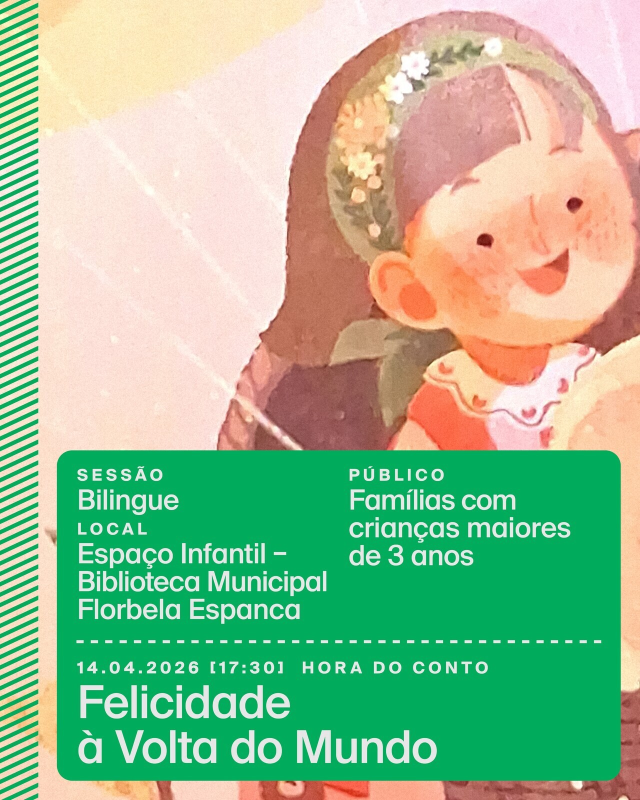 17:30 – Felicidade à Volta do MundoNesta hora do conto especial, vamos viajar por diferentes países e descobrir o que é a felicidade em cada lugar do Mundo. Juntos, vamos reconhecer palavras mágicas e hábitos que nos trazem alegria, tendo como ponto de partida o livro "Happiness Around the World".