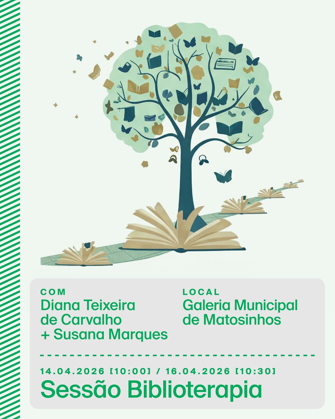 10:00 – Sessão de BiblioterapiaNum ambiente de escuta, empatia e confiança, através da reflexão e partilha da leitura a sessão de biblioterapia procura promover o bem-estar emocional e o autoconhecimento, evidenciando o potencial da literatura como ferramenta de cuidado e desenvolvimento pessoal.